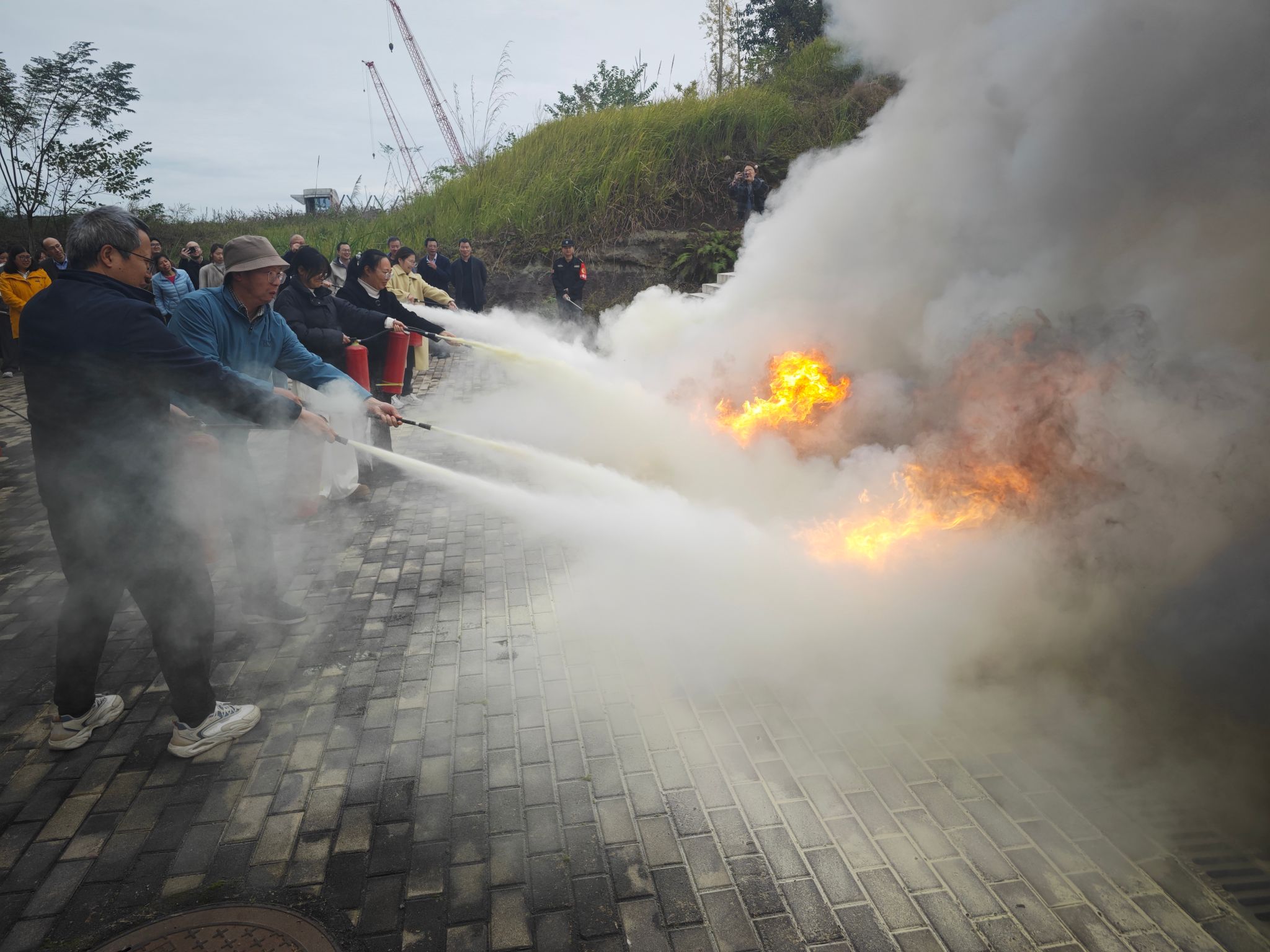 疏散结束后,保卫处工作人员为师生系统讲解了日常防火要点、分类火灾扑救方法,现场演示了干粉灭火器“提、拔、握、压”操作步骤及消防水带的连接技巧。随后,参训师生在指导下亲手操作灭火器扑灭模拟火源,实现了从理论到实践的转化,提升了火灾扑救实战能力。